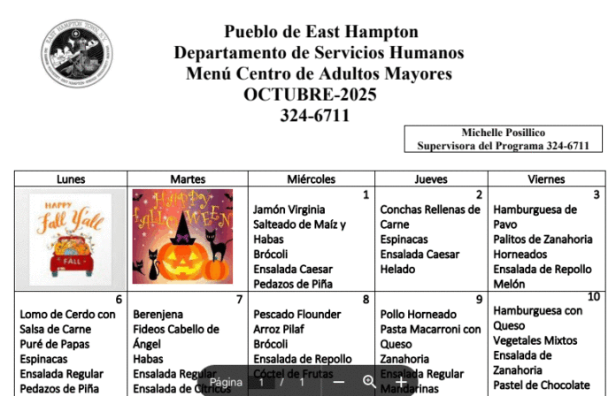 Pueblo de East Hampton Departamento de Servicios Humanos : Menú Centro de la Tercera Edad OCTUBRE-2025